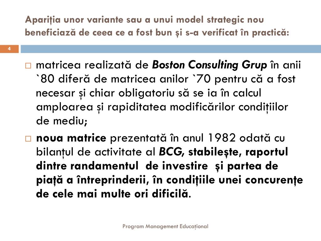 Apariţia unor variante sau a unui model strategic nou beneficiază de ceea ce a fost bun şi s-a verificat în practică: • matricea realizată de Boston Consulting Grup în anii `80 diferă de matricea anilor `70 pentru că a fost necesar şi chiar obligatoriu să se ia în calcul amploarea şi rapiditatea modificărilor condiţiilor de mediu; • noua matrice prezentată în anul 1982 odată cu bilanţul de activitate al BCG,stabileşte,raportul dintre randamentul de investire şi partea de piaţă a întreprinderii, în condiţiile unei concurenţe de cele mai multe ori dificilă. Program Management Educaţional