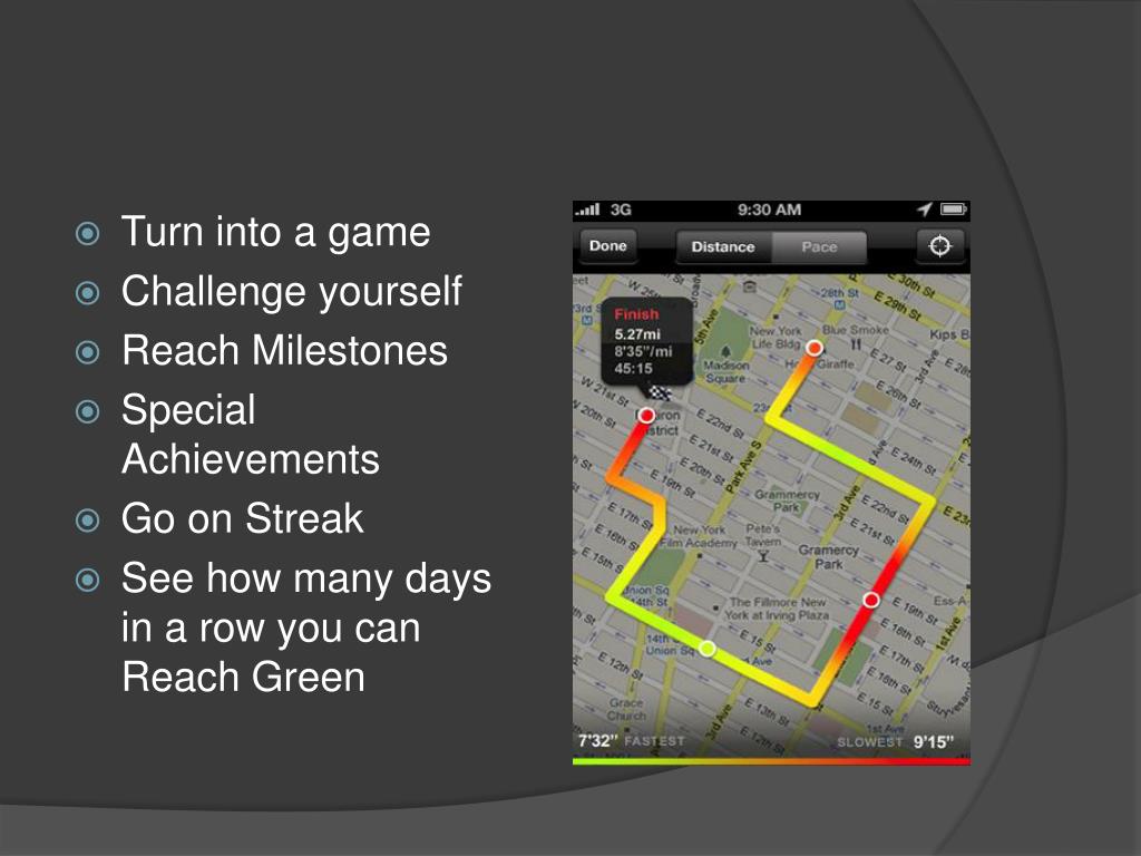 Turn into a game • Challenge yourself • Reach Milestones • Special Achievements • Go on Streak • See how many days in a row you can Reach Green
