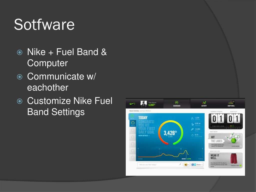 Sotfware • Nike + Fuel Band & Computer • Communicate w/ eachother • Customize Nike Fuel Band Settings