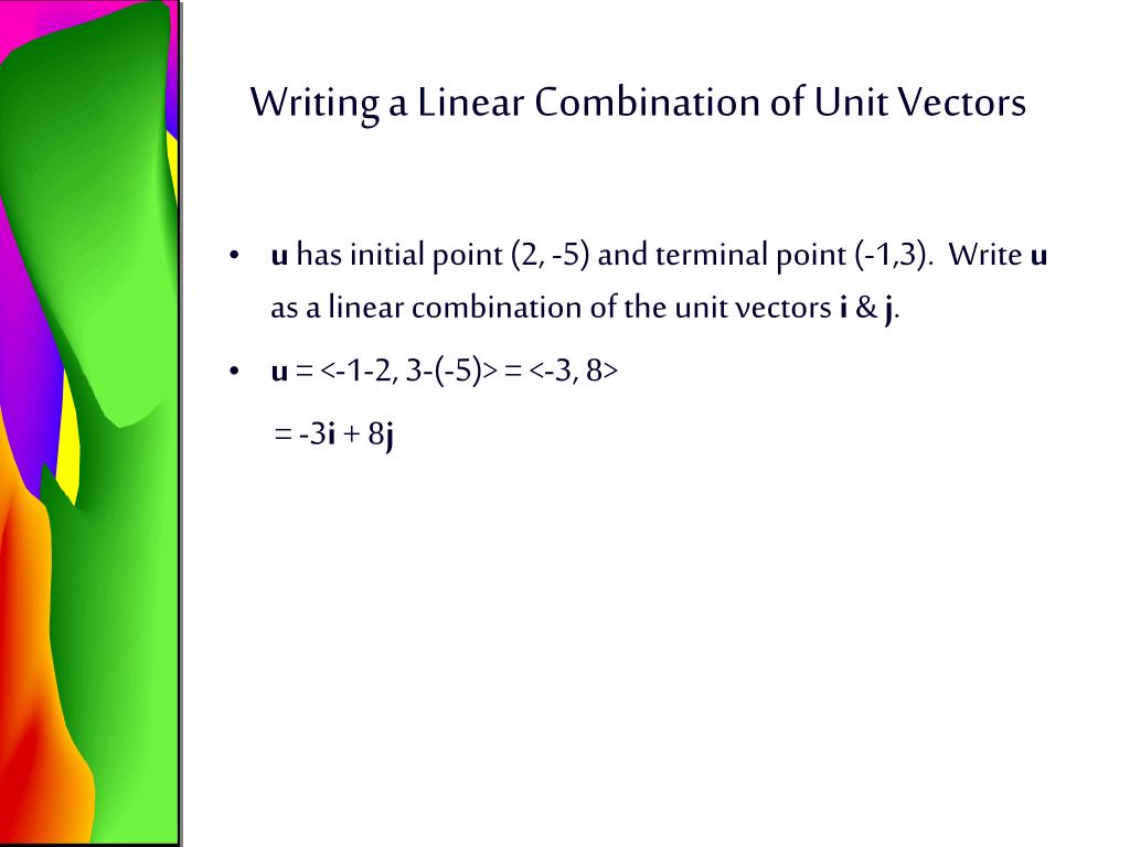 Writing a Linear Combination of Unit Vectors • u has initial point (2, -5) and terminal point (-1,3). Write u as a linear combination of the unit vectors i & j. • u= <-1-2, 3-(-5)> = <-3, 8> = -3i + 8j