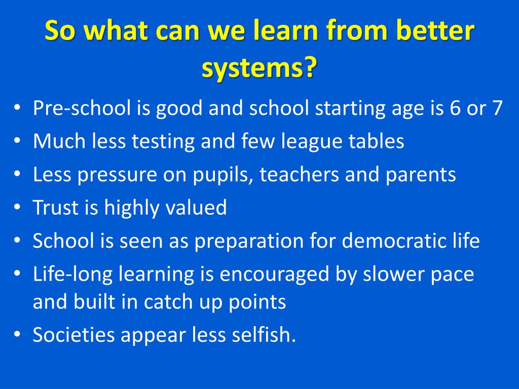 So what can we learn from better systems? • Pre-school is good and school starting age is 6 or 7 • Much less testing and few league tables • Less pressure on pupils, teachers and parents • Trust is highly valued • School is seen as preparation for democratic life • Life-long learning is encouraged by slower pace and built in catch up points • Societies appear less selfish.