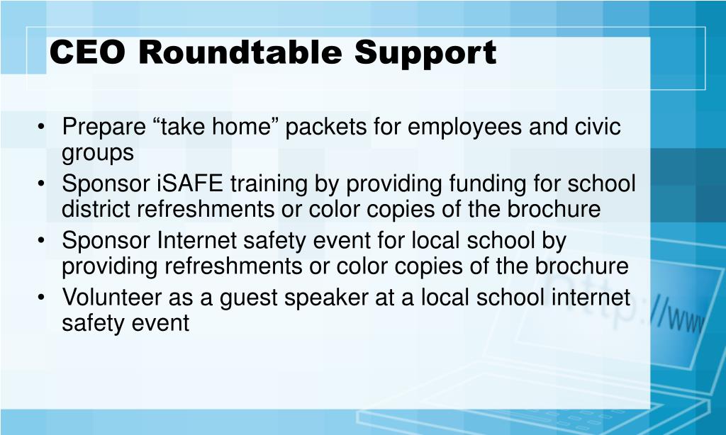 CEO Roundtable Support • Prepare “take home” packets for employees and civic groups • Sponsor iSAFE training by providing funding for school district refreshments or color copies of the brochure • Sponsor Internet safety event for local school by providing refreshments or color copies of the brochure • Volunteer as a guest speaker at a local school internet safety event