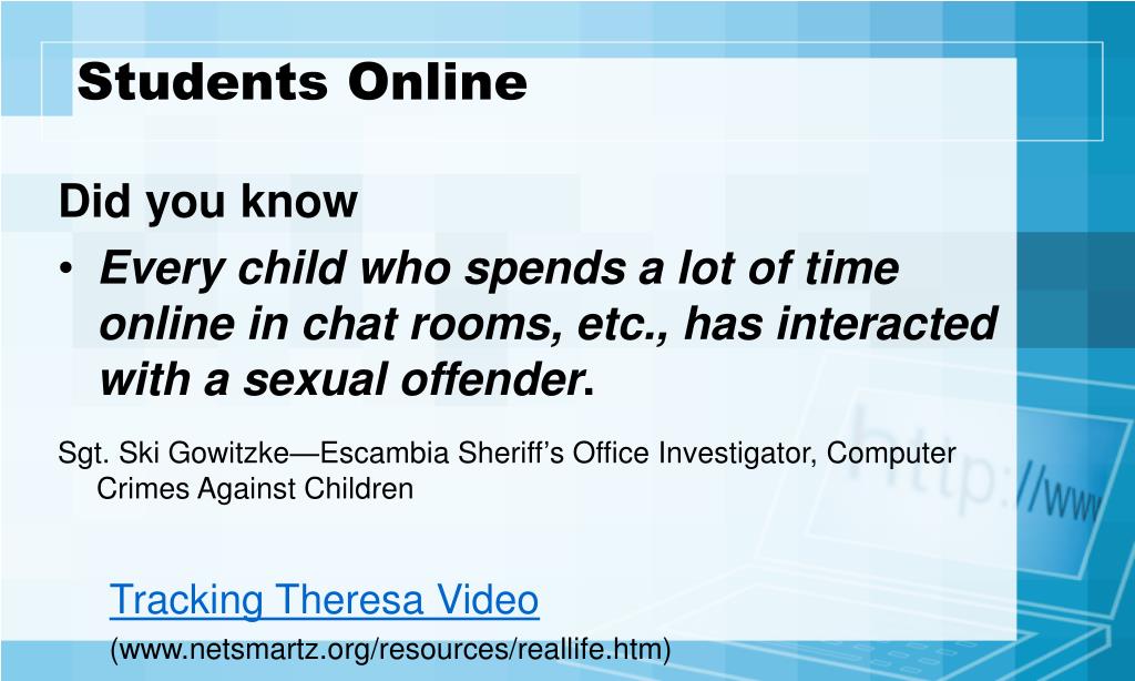 Students Online Did you know • Every child who spends a lot of time online in chat rooms, etc., has interacted with a sexual offender. Sgt. Ski Gowitzke—Escambia Sheriff’s Office Investigator, Computer Crimes Against Children Tracking Theresa Video (www.netsmartz.org/resources/reallife.htm)