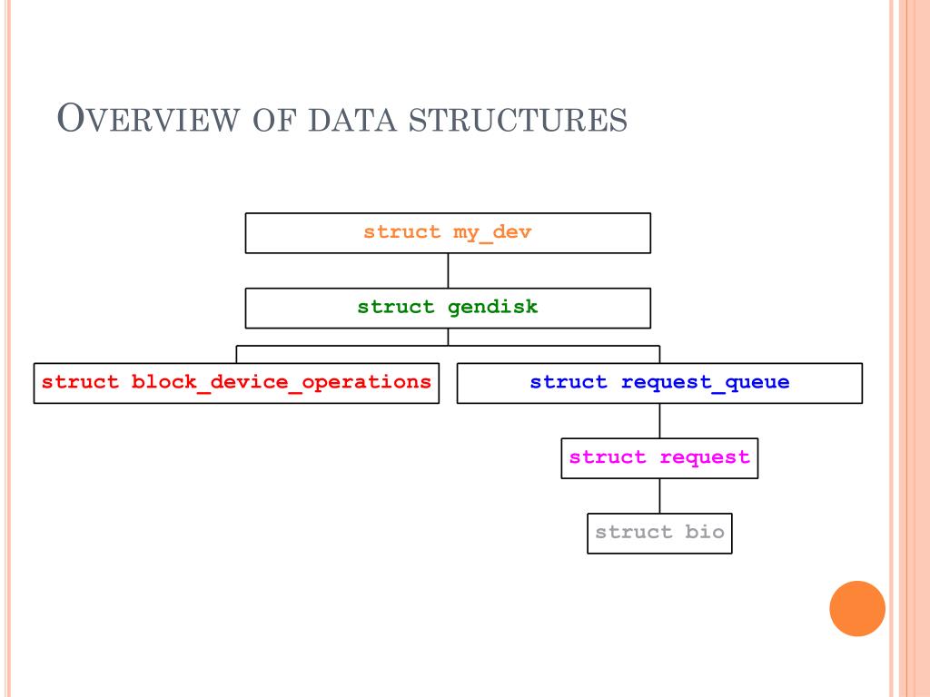 Install the gendisk structure ... Device.gd = alloc_disk(16); if (!Device.gd) { /* error handling */ } Device.gd->major = major_num; Device.gd->first_minor = 0; Device.gd->fops = &sbd_ops; Device.gd->queue = Queue; Device.gd->private_data = Device; ...