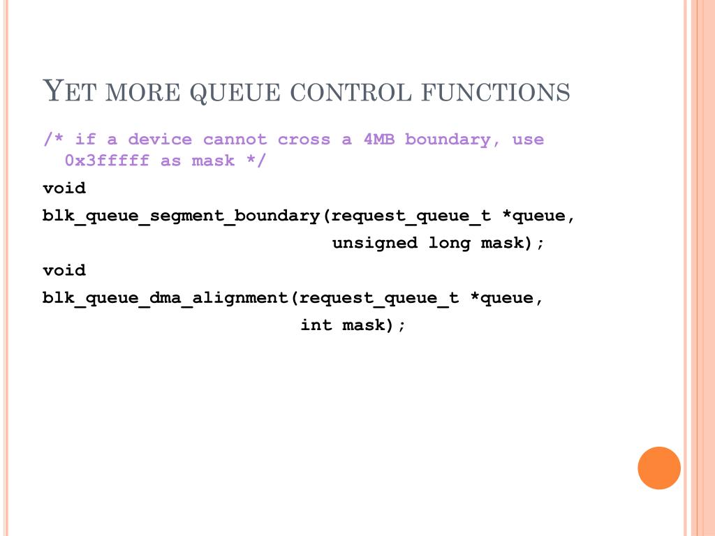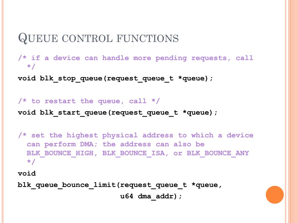 Queue control functions /* if a device can handle more pending requests, call */ void blk_stop_queue(request_queue_t *queue); /* to restart the queue, call */ void blk_start_queue(request_queue_t *queue); /* set the highest physical address to which a device can perform DMA; the address can also be BLK_BOUNCE_HIGH, BLK_BOUNCE_ISA, or BLK_BOUNCE_ANY */ void blk_queue_bounce_limit(request_queue_t *queue, u64 dma_addr);