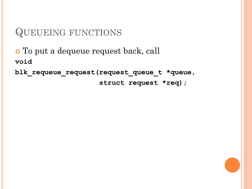 Queueing functions • To put a dequeue request back, call void blk_requeue_request(request_queue_t *queue, struct request *req);
