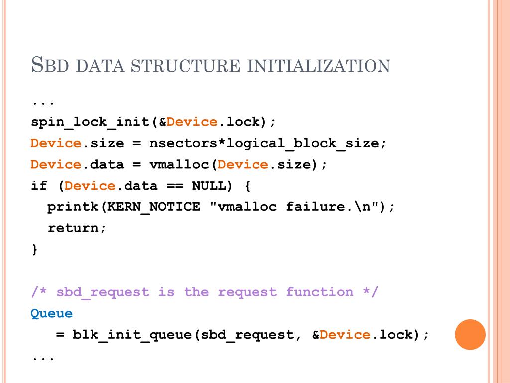 Sbd data structure initialization ... spin_lock_init(&Device.lock); Device.size = nsectors*logical_block_size; Device.data = vmalloc(Device.size); if (Device.data == NULL) { printk(KERN_NOTICE "vmalloc failure.\n"); return; } /* sbd_request is the request function */ Queue = blk_init_queue(sbd_request, &Device.lock); ...