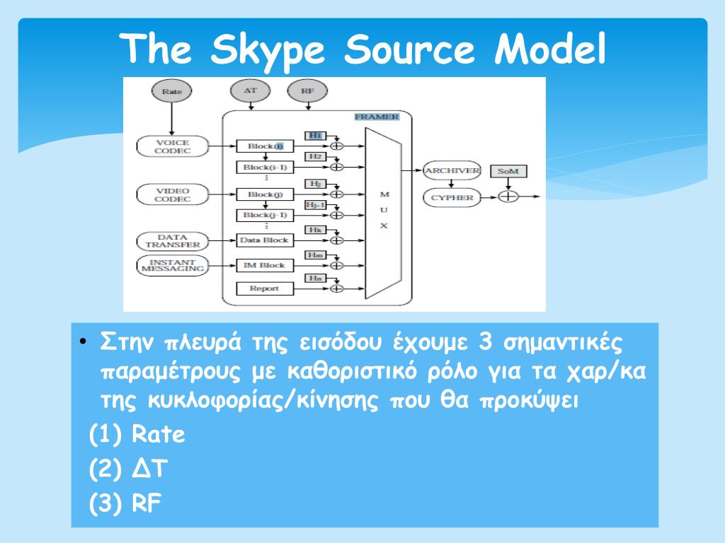 The Skype Source Model • Στην πλευρά της εισόδου έχουμε 3 σημαντικές παραμέτρους με καθοριστικό ρόλο για τα χαρ/κα της κυκλοφορίας/κίνησης που θα προκύψει (1) Rate (2) ΔΤ (3) RF