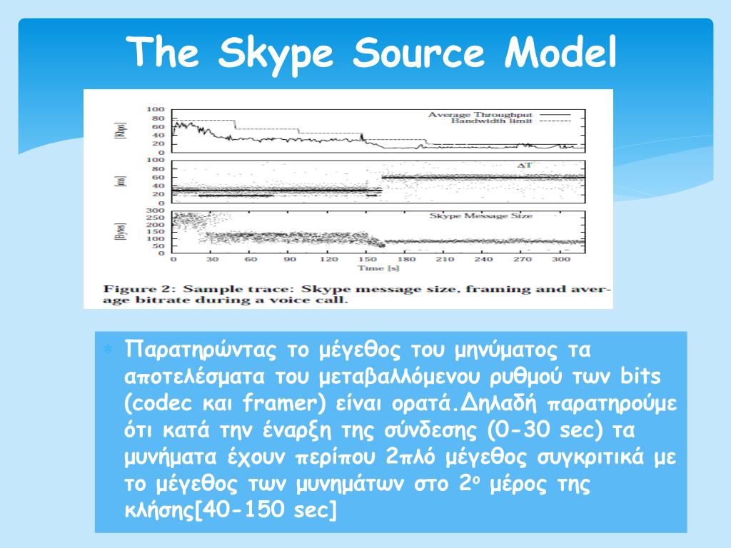 The Skype Source Model Παρατηρώντας το μέγεθος του μηνύματος τα αποτελέσματα του μεταβαλλόμενου ρυθμού των bits (codec και framer) είναι ορατά.Δηλαδή παρατηρούμε ότι κατά την έναρξη της σύνδεσης (0-30 sec)τα μυνήματα έχουν περίπου 2πλό μέγεθος συγκριτικά με το μέγεθος των μυνημάτων στο 2ο μέρος της κλήσης[40-150 sec]