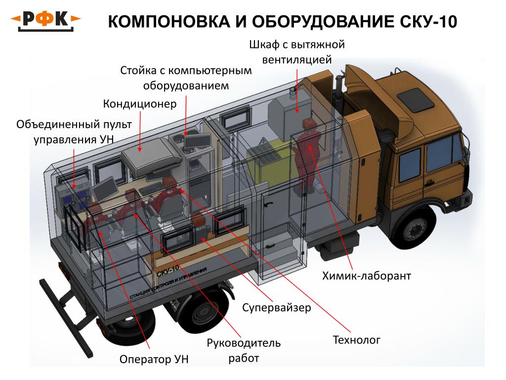 СТАНЦИЯ КОНТРОЛЯ И УПРАВЛЕНИЯ СКУ-10 Станция контроля и управления СКУ-10, предназначена для автоматизированного управления установками насосными УН-2250 (УН) и установкой смесительной УС-10 (УС) в режиме гидроразрыва нефтяных и газовых пластов (ГРП) с поддержанием, заданных программой промышленного компьютера или оператором, расходов рабочей жидкости, сухих и жидких химических реагентов, концентрации проппанта, а также фиксации контролируемых параметров (прямых и расчетных), архивирования режимов и параметров работы Комплекса, а также регистрации режимов и параметров на бумажном носителе. Вид климатического исполнения «У1» ГОСТ 15150-69.