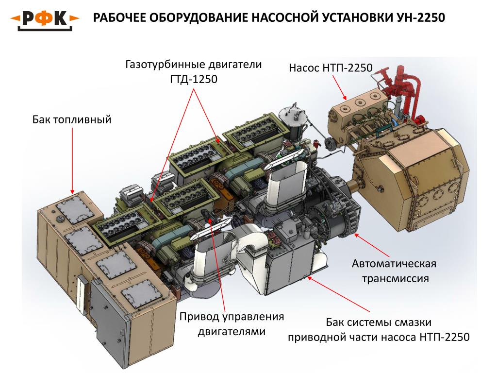 РАБОЧЕЕ ОБОРУДОВАНИЕ НАСОСНОЙ УСТАНОВКИ УН-2250 Газотурбинные двигателиГТД-1250 Насос НТП-2250 Бак топливный Автоматическая трансмиссия Привод управлениядвигателями Бак системы смазкиприводной части насоса НТП-2250