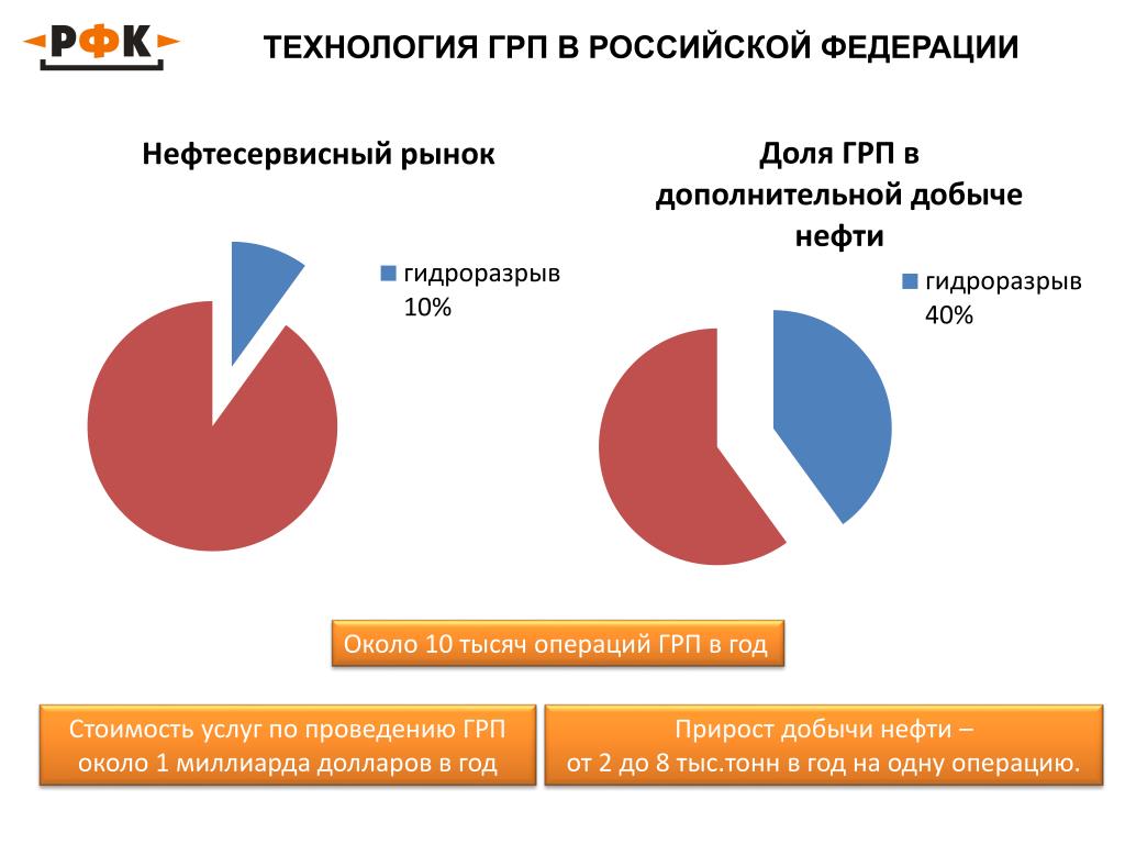 ТЕХНОЛОГИЯ ГРП В РОССИЙСКОЙ ФЕДЕРАЦИИ Около 10 тысяч операций ГРП в год Стоимость услуг по проведению ГРПоколо 1 миллиарда долларов в год Прирост добычи нефти – от 2 до 8 тыс.тонн в год на одну операцию.