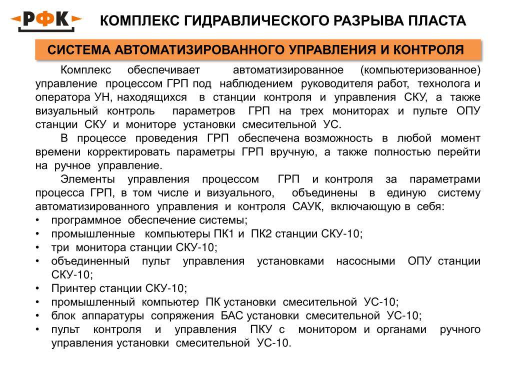 КОМПЛЕКС ГИДРАВЛИЧЕСКОГО РАЗРЫВА ПЛАСТА СИСТЕМА АВТОМАТИЗИРОВАННОГО УПРАВЛЕНИЯ И КОНТРОЛЯ • Комплекс обеспечивает автоматизированное (компьютеризованное) управление процессом ГРП под наблюдением руководителя работ, технолога и оператора УН, находящихся в станции контроля и управления СКУ, а также визуальный контроль параметров ГРП на трех мониторах и пульте ОПУ станции СКУ и мониторе установки смесительной УС. • В процессе проведения ГРП обеспечена возможность в любой момент времени корректировать параметры ГРП вручную, а также полностью перейти на ручное управление. • Элементы управления процессом ГРП и контроля за параметрами процесса ГРП, в том числе и визуального, объединены в единую систему автоматизированного управления и контроля САУК, включающую в себя: • программное обеспечение системы; • промышленные компьютеры ПК1 и ПК2 станции СКУ-10; • три монитора станции СКУ-10; • объединенный пульт управления установками насосными ОПУ станции СКУ-10; • Принтер станции СКУ-10; • промышленный компьютер ПК установки смесительной УС-10; • блок аппаратуры сопряжения БАС установки смесительной УС-10; • пульт контроля и управления ПКУ с монитором и органами ручного управления установки смесительной УС-10.