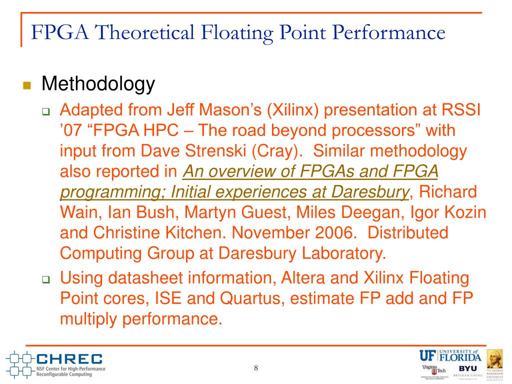 FPGA Theoretical Floating Point Performance • Methodology • Adapted from Jeff Mason’s (Xilinx) presentation at RSSI ’07 “FPGA HPC – The road beyond processors” with input from Dave Strenski (Cray). Similar methodology also reported in An overview of FPGAs and FPGA programming; Initial experiences at Daresbury, Richard Wain, Ian Bush, Martyn Guest, Miles Deegan, Igor Kozin and Christine Kitchen. November 2006. Distributed Computing Group at Daresbury Laboratory. • Using datasheet information, Altera and Xilinx Floating Point cores, ISE and Quartus, estimate FP add and FP multiply performance.