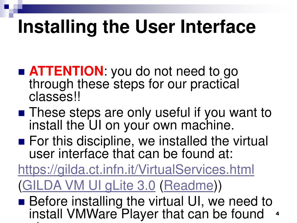 Installing the User Interface • ATTENTION: you do not need to go through these steps for our practical classes!! • These steps are only useful if you want to install the UI on your own machine. • For this discipline, we installed the virtual user interface that can be found at: https://gilda.ct.infn.it/VirtualServices.html (GILDA VM UI gLite 3.0 (Readme)) • Before installing the virtual UI, we need to install VMWare Player that can be found at: http://www.vmware.com/products/player/
