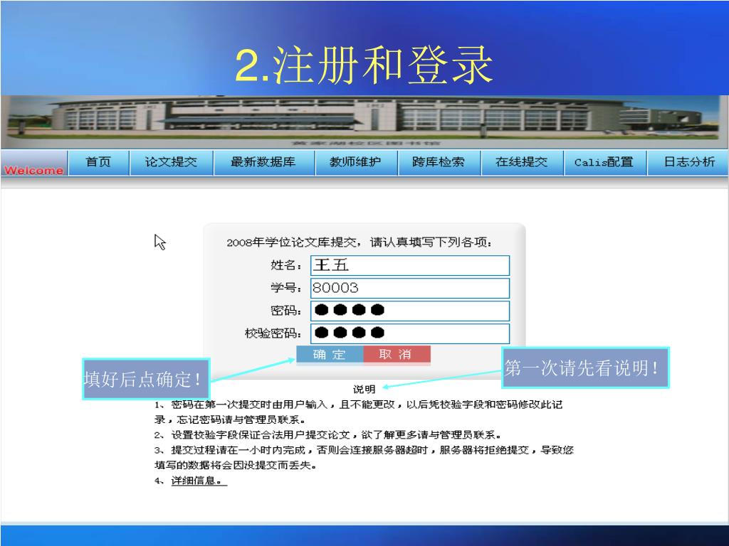 2.注册和登录 第一次请先看说明! 填好后点确定!