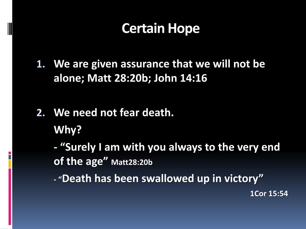 Certain Hope • We are given assurance that we will not be alone; Matt 28:20b; John 14:16 • We need not fear death. Why? - “Surely I am with you always to the very end of the age” Matt28:20b - “Death has been swallowed up in victory” 1Cor 15:54