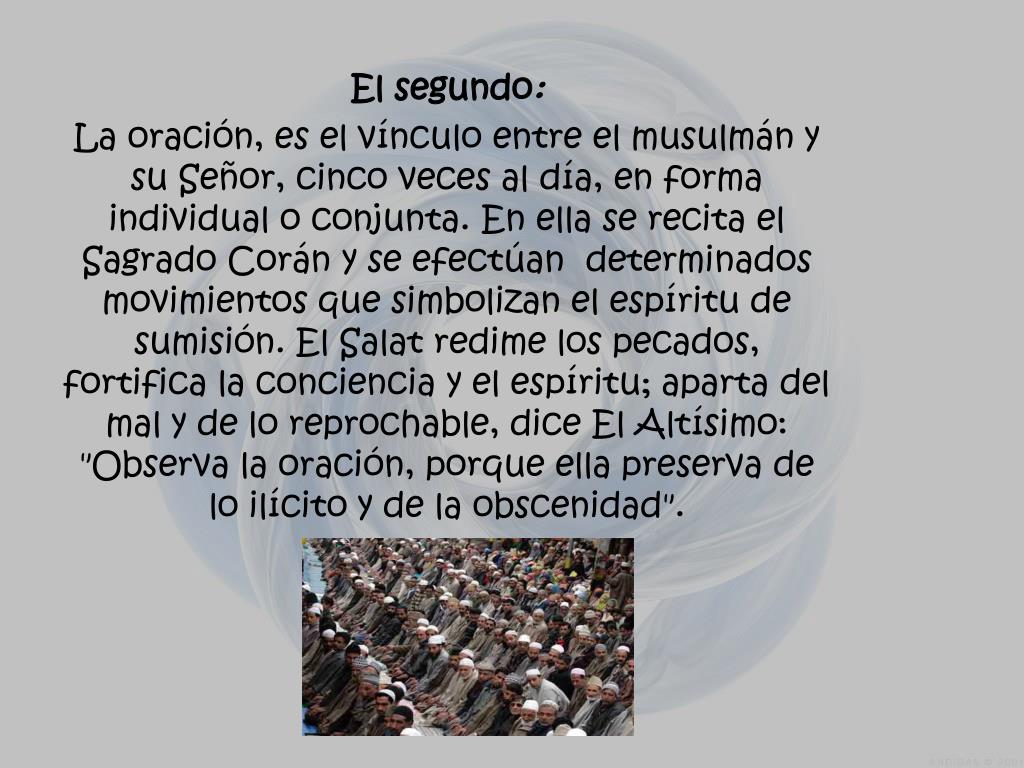 El segundo: La oración, es el vínculo entre el musulmán y su Señor, cinco veces al día, en forma individual o conjunta. En ella se recita el Sagrado Corán y se efectúan determinados movimientos que simbolizan el espíritu de sumisión. El Salat redime los pecados, fortifica la conciencia y el espíritu; aparta del mal y de lo reprochable, dice El Altísimo: "Observa la oración, porque ella preserva de lo ilícito y de la obscenidad".