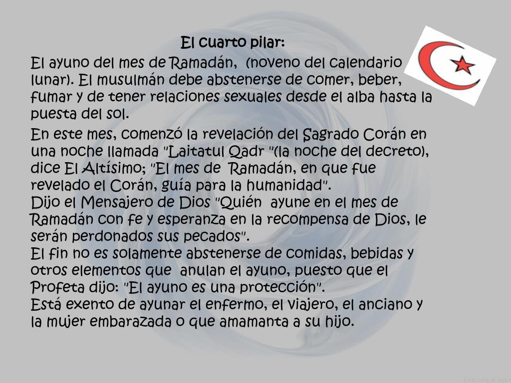 El cuarto pilar: El ayuno del mes de Ramadán, (noveno del calendario lunar). El musulmán debe abstenerse de comer, beber, fumar y de tener relaciones sexuales desde el alba hasta la puesta del sol. En este mes, comenzó la revelación del Sagrado Corán en una noche llamada "LaitatulQadr "(la noche del decreto), dice El Altísimo; "El mes de Ramadán, en que fue revelado el Corán, guía para la humanidad".Dijo el Mensajero de Dios "Quién ayune en el mes de Ramadán con fe y esperanza en la recompensa de Dios, le serán perdonados sus pecados".El fin no es solamente abstenerse de comidas, bebidas y otros elementos que anulan el ayuno, puesto que el Profeta dijo: "El ayuno es una protección".Está exento de ayunar el enfermo, el viajero, el anciano y la mujer embarazada o que amamanta a su hijo.