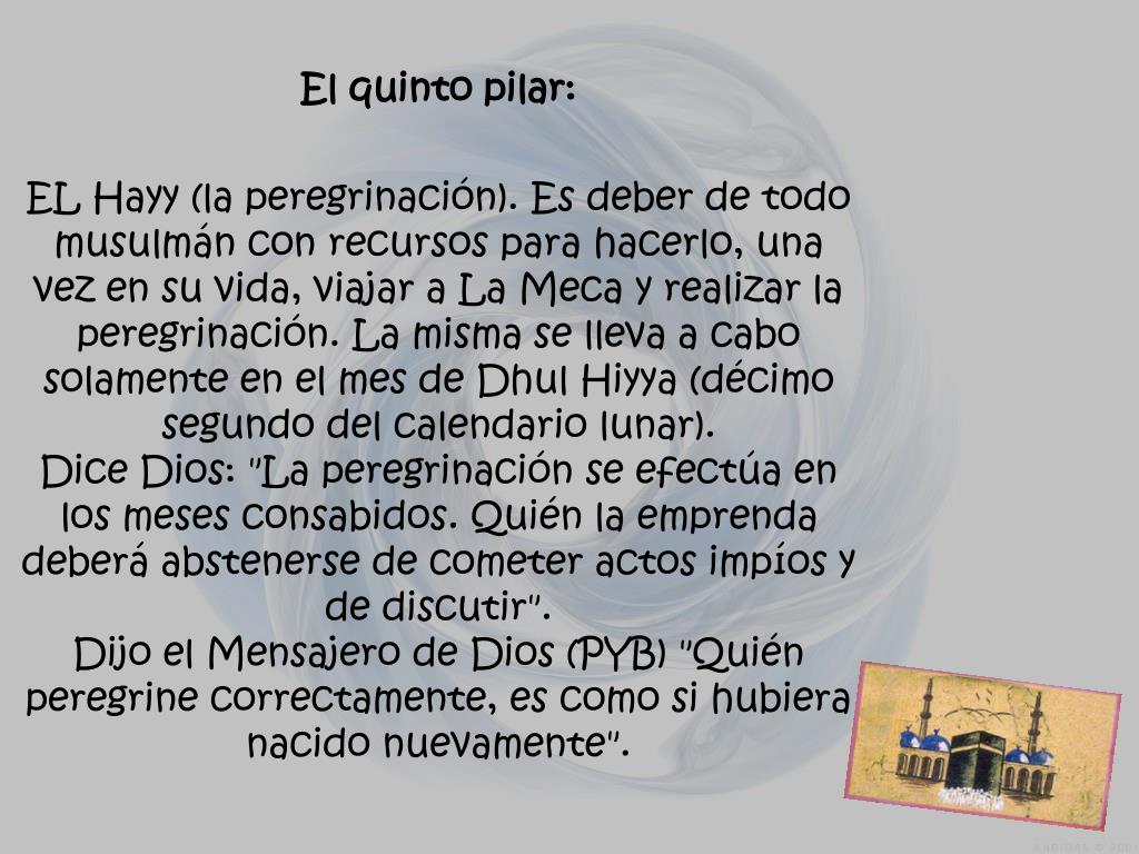 El quinto pilar: EL Hayy (la peregrinación). Es deber de todo musulmán con recursos para hacerlo, una vez en su vida, viajar a La Meca y realizar la peregrinación. La misma se lleva a cabo solamente en el mes de DhulHiyya (décimo segundo del calendario lunar).Dice Dios: "La peregrinación se efectúa en los meses consabidos. Quién la emprenda deberá abstenerse de cometer actos impíos y de discutir".Dijo el Mensajero de Dios (PYB) "Quién peregrine correctamente, es como si hubiera nacido nuevamente".
