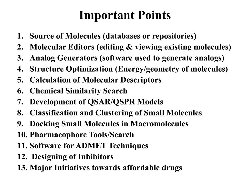 Important Points Source of Molecules (databases or repositories) Molecular Editors (editing & viewing existing molecules) Analog Generators (software used to generate analogs) Structure Optimization (Energy/geometry of molecules) Calculation of Molecular Descriptors Chemical Similarity Search Development of QSAR/QSPR Models Classification and Clustering of Small Molecules Docking Small Molecules in Macromolecules Pharmacophore Tools/Search Software for ADMET Techniques Designing of Inhibitors Major Initiatives towards affordable drugs