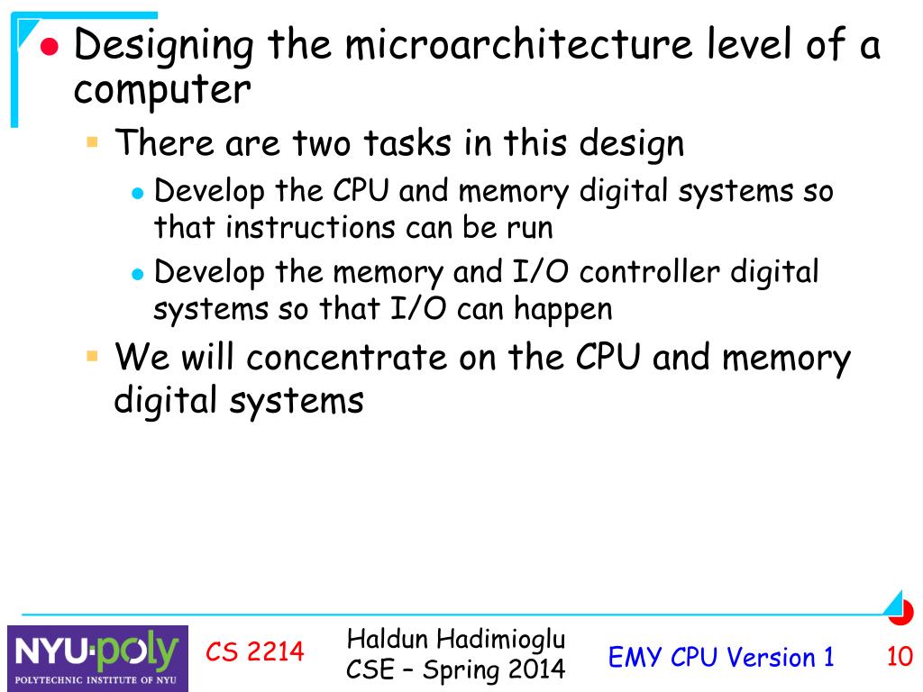 Designing the microarchitecture level of a computer • There are two tasks in this design • Develop the CPU and memory digital systems so that instructions can be run • Develop the memory and I/O controller digital systems so that I/O can happen • We will concentrate on the CPU and memory digital systems CS 2214