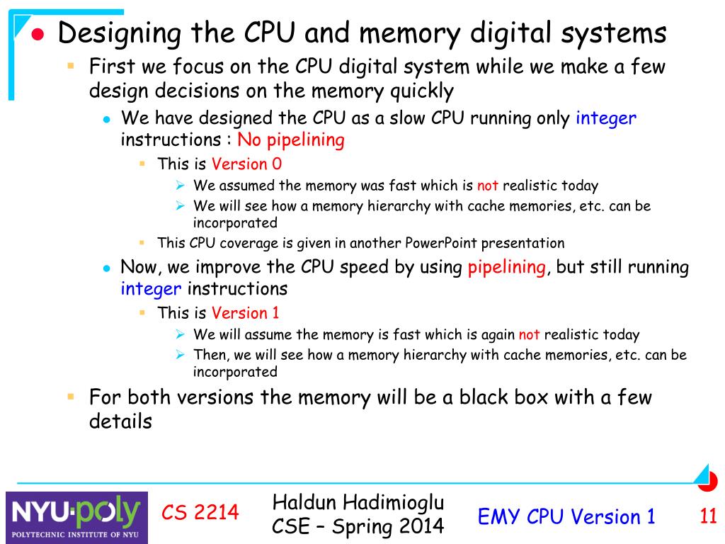 Outline • Introduction • Version 1 EMY CPU : Pipelined EMY CPU • It executes only integer instructions • How a memory hierarchy can be attached to the pipelined EMY CPU is also studied • Version 0, the Unpipelined EMY CPU is described in another presentation • Handout to use • Pipelined EMY CPU CS 2214