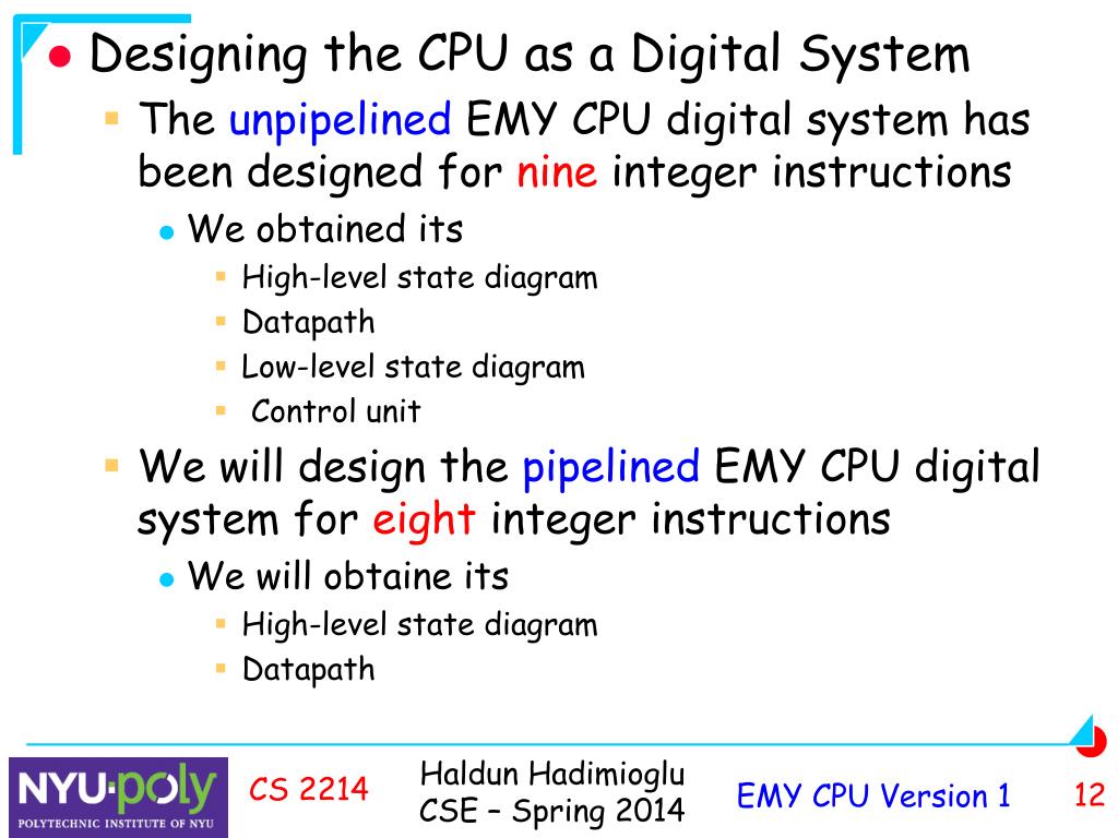 Designing the CPU as a Digital System • The unpipelined EMY CPU digital system has been designed for nine integer instructions • We obtained its • High-level state diagram • Datapath • Low-level state diagram • Control unit • We will design the pipelined EMY CPU digital system for eight integer instructions • We will obtaine its • High-level state diagram • Datapath CS 2214