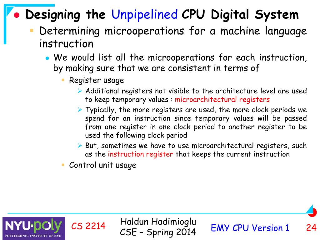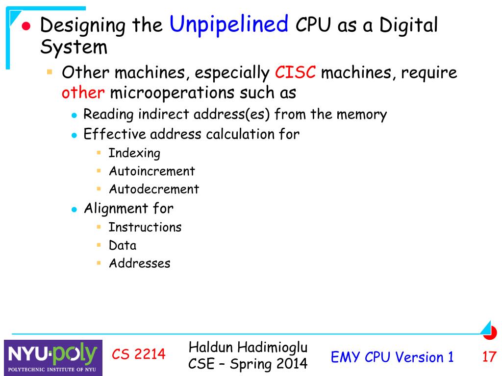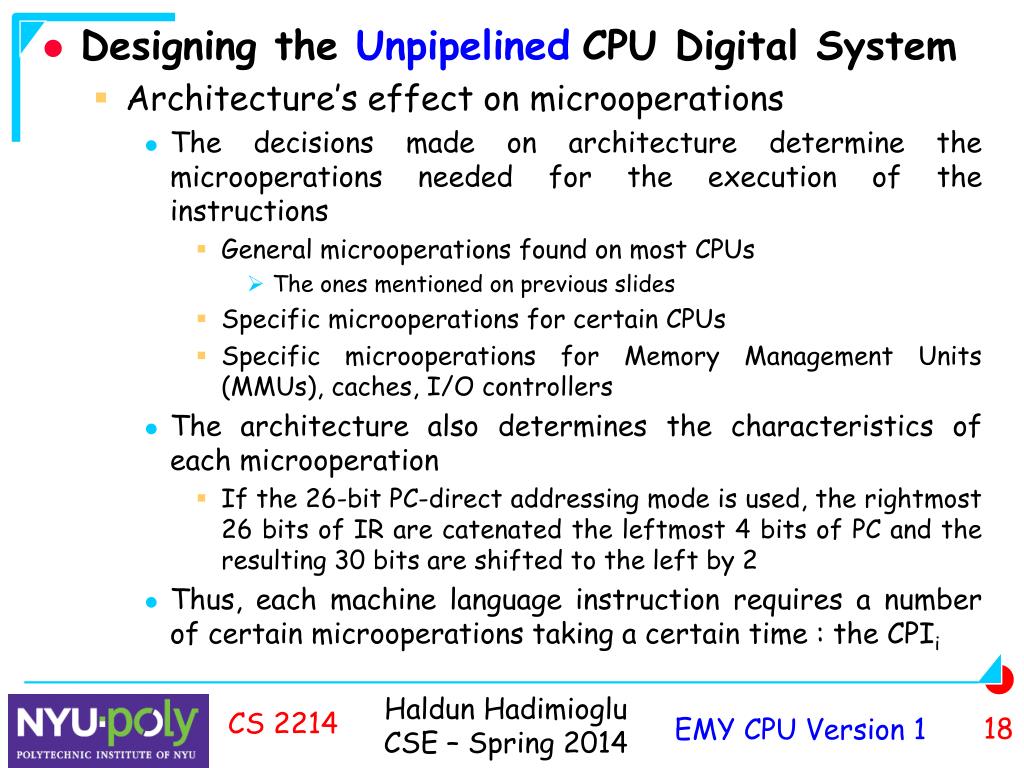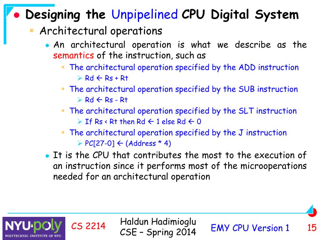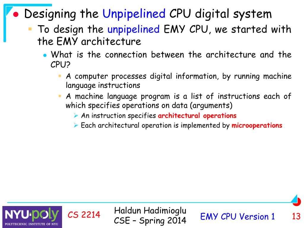 Designing the Unpipelined CPU digital system • To design the unpipelined EMY CPU, we started with the EMY architecture • What is the connection between the architecture and the CPU? • A computer processes digital information, by running machine language instructions • A machine language program is a list of instructions each of which specifies operations on data (arguments) • An instruction specifies architectural operations • Each architectural operation is implemented by microoperations CS 2214