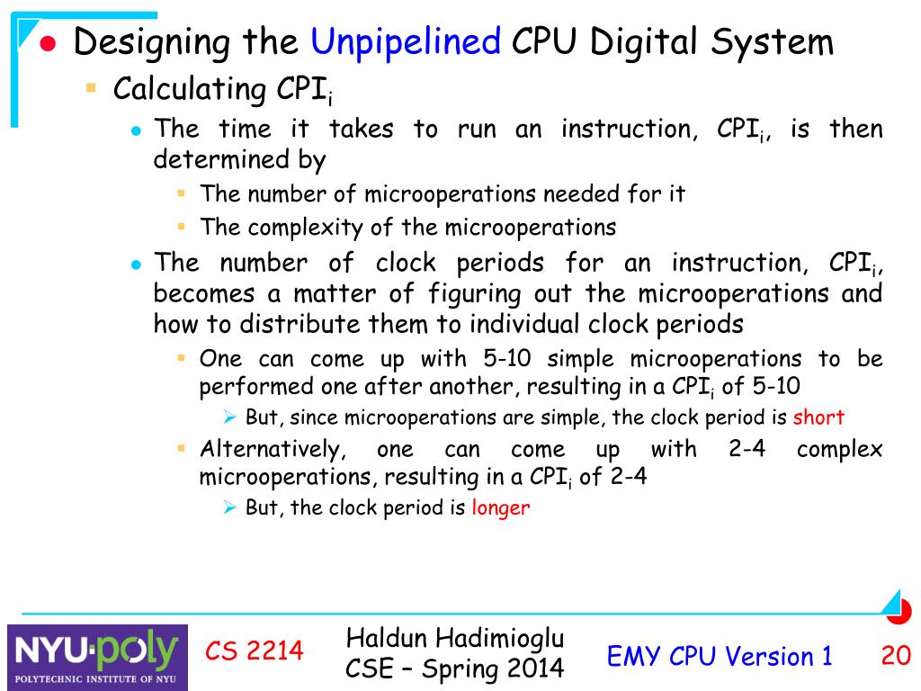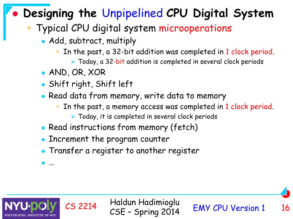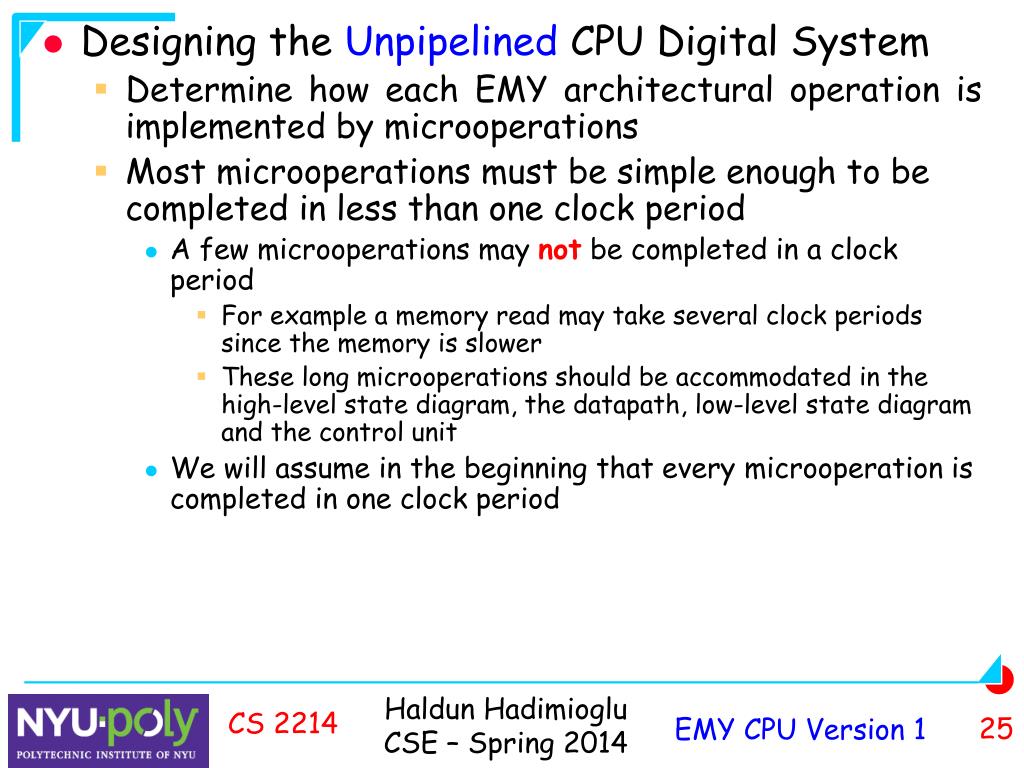 Designing the Unpipelined CPU Digital System • Determine how each EMY architectural operation is implemented by microoperations • Most microoperations must be simple enough to be completed in less than one clock period • A few microoperations may not be completed in a clock period • For example a memory read may take several clock periods since the memory is slower • These long microoperations should be accommodated in the high-level state diagram, the datapath, low-level state diagram and the control unit • We will assume in the beginning that every microoperation is completed in one clock period CS 2214