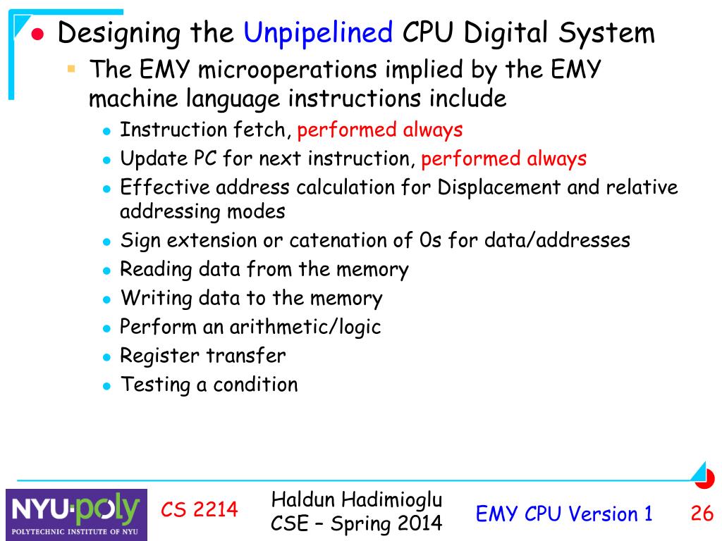 Designing the Unpipelined CPU Digital System • The EMY microoperations implied by the EMY machine language instructions include • Instruction fetch, performedalways • Update PC for next instruction, performed always • Effective address calculation for Displacement and relative addressing modes • Sign extension or catenation of 0s for data/addresses • Reading data from the memory • Writing data to the memory • Perform an arithmetic/logic • Register transfer • Testing a condition CS 2214