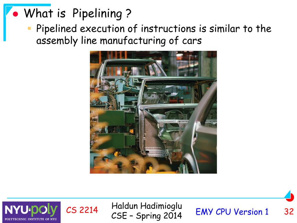 What is Pipelining ? • Pipelined execution of instructions is similar to the assembly line manufacturing of cars CS 2214
