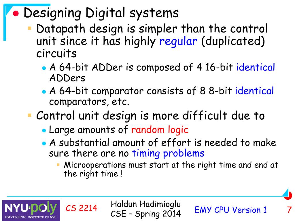Designing Digital systems • Datapath design is simpler than the control unit since it has highly regular (duplicated) circuits • A 64-bit ADDer is composed of 4 16-bit identical ADDers • A 64-bit comparator consists of 8 8-bit identical comparators, etc. • Control unit design is more difficult due to • Large amounts of random logic • A substantial amount of effort is needed to make sure there are no timing problems • Microoperations must start at the right time and end at the right time ! CS 2214