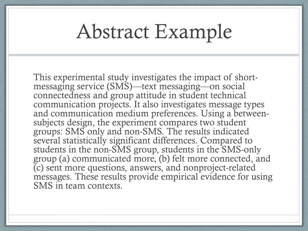 Abstract Example This experimental study investigates the impact of short-messaging service (SMS)—text messaging—on social connectedness and group attitude in student technical communication projects. It also investigates message types and communication medium preferences. Using a between-subjects design, the experiment compares two student groups: SMS only and non-SMS. The results indicated several statistically significant differences. Compared to students in the non-SMS group, students in the SMS-only group (a) communicated more, (b) felt more connected, and (c) sent more questions, answers, and nonproject-related messages. These results provide empirical evidence for using SMS in team contexts.