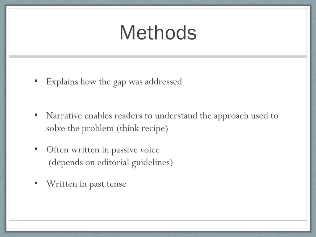 Methods • Explains how the gap was addressed • Narrative enables readers to understand the approach used to solve the problem (think recipe) • Often written in passive voice (depends on editorial guidelines) • Written in past tense