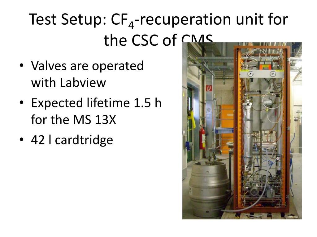Test Setup: CF4-recuperation unit for the CSC of CMS • Valves are operated with Labview • Expected lifetime 1.5 h for the MS 13X • 42 l cardtridge