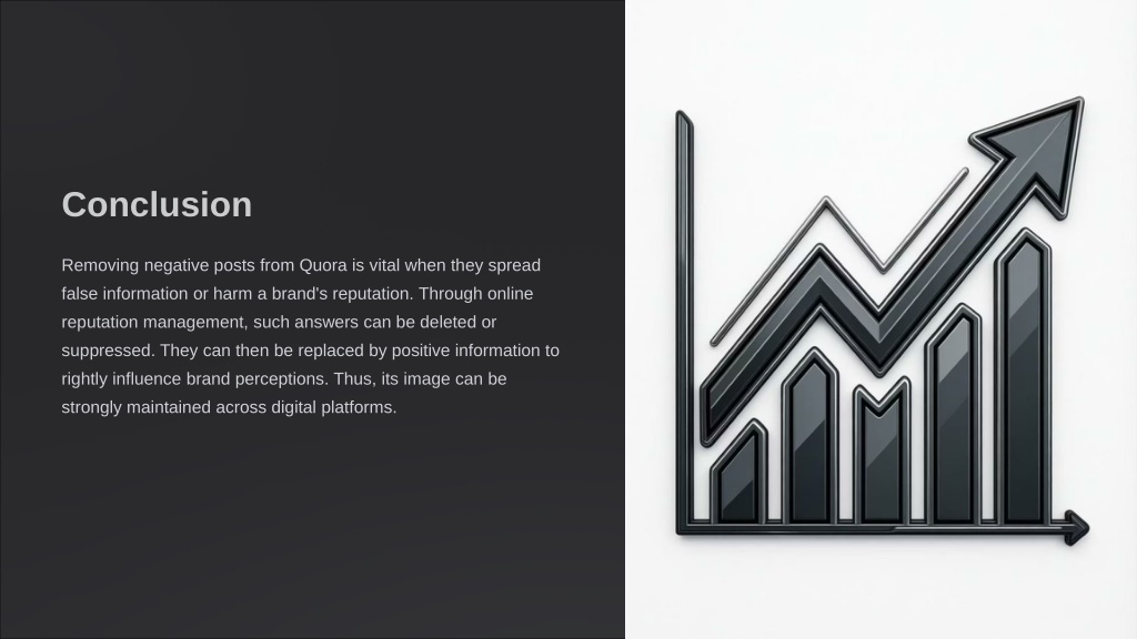 9. Conclusion Removing negative posts from Quora is vital when they spread false information or harm a brand's reputation. Through online reputation management, such answers can be deleted or suppressed. They can then be replaced by positive information to rightly influence brand perceptions. Thus, its image can be strongly maintained across digital platforms.