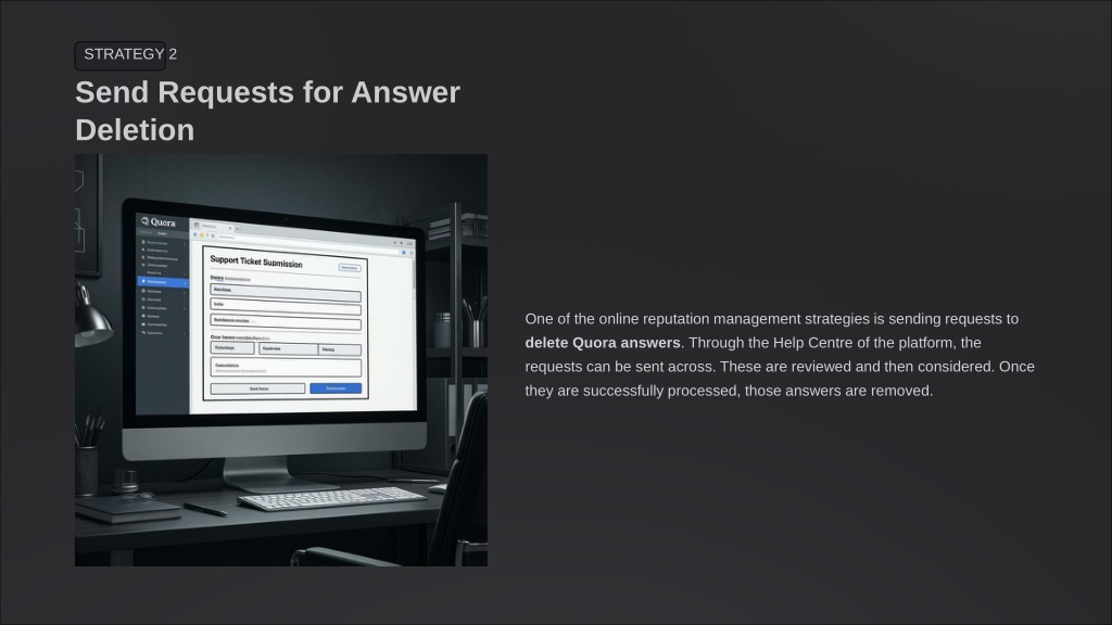 7. STRATEGY 2 Send Requests for Answer Deletion One of the online reputation management strategies is sending requests to delete Quora answers. Through the Help Centre of the platform, the requests can be sent across. These are reviewed and then considered. Once they are successfully processed, those answers are removed.
