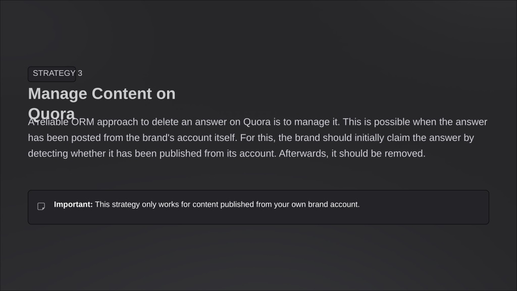8. STRATEGY 3 Manage Content on Quora A reliable ORM approach to delete an answer on Quora is to manage it. This is possible when the answer has been posted from the brand's account itself. For this, the brand should initially claim the answer by detecting whether it has been published from its account. Afterwards, it should be removed. Important: This strategy only works for content published from your own brand account.