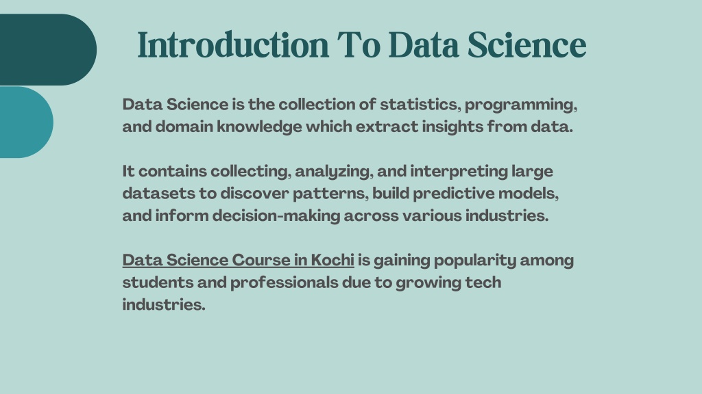 Introduction To Data Science Data Science is the collection of statistics, programming, and domain knowledge which extract insights from data. It contains collecting, analyzing, and interpreting large datasets to discover patterns, build predictive models, and inform decision-making across various industries. Data Science Course in Kochi is gaining popularity among students and professionals due to growing tech industries.