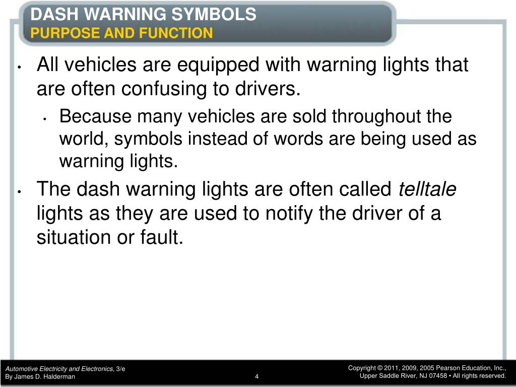 DASH WARNING SYMBOLSPURPOSE AND FUNCTION • All vehicles are equipped with warning lights that are often confusing to drivers. • Because many vehicles are sold throughout the world, symbols instead of words are being used as warning lights. • The dash warning lights are often called telltale lights as they are used to notify the driver of a situation or fault.