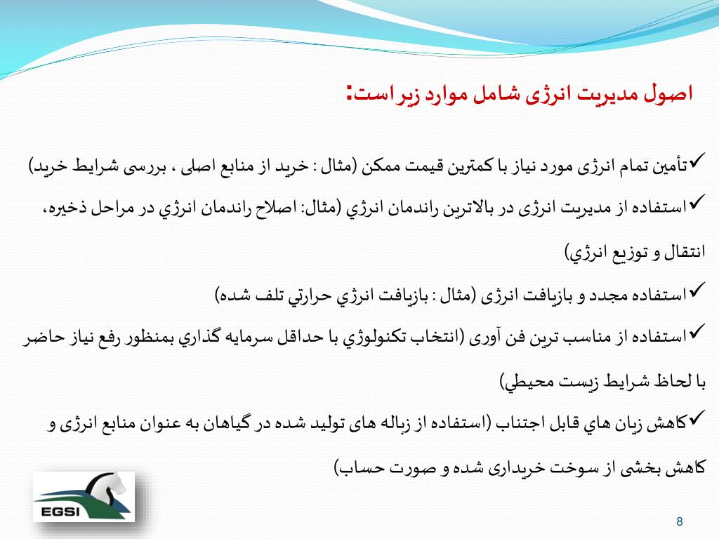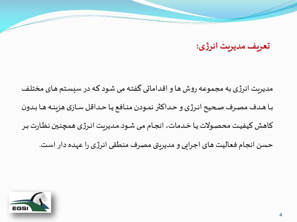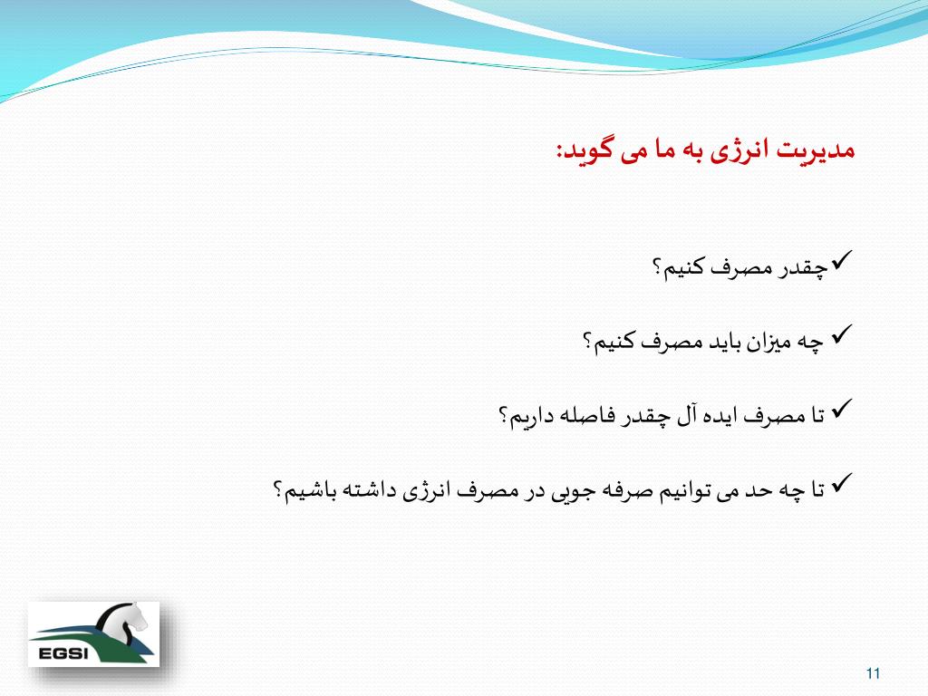 مدیریت انرژی به ما می گوید: • چقدر مصرف کنیم؟ • چه میزان باید مصرف کنیم؟ • تا مصرف ایده آل چقدر فاصله داریم؟ • تا چه حد می توانیم صرفه جویی در مصرف انرژی داشته باشیم؟