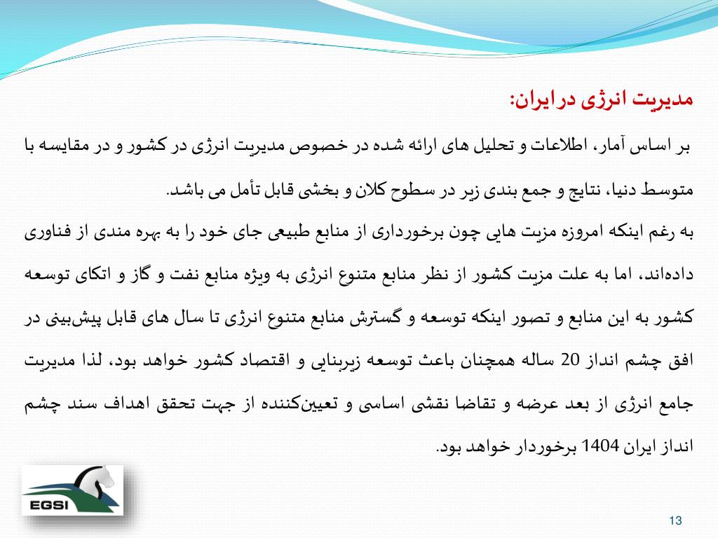 مدیریت انرژی در ایران: • بر اساس آمار، اطلاعات و تحلیل های ارائه شده در خصوص مدیریت انرژی در کشور و در مقایسه با متوسط دنیا، نتایج و جمع بندی زیر در سطوح کلان و بخشی قابل تأمل می باشد. • به رغم اینکه امروزه مزیت هایی چون برخورداری از منابع طبیعی جای خود را به بهره مندی از فناوری دادهاند، اما به علت مزیت کشور از نظر منابع متنوع انرژی به ویژه منابع نفت و گاز و اتکای توسعه کشور به این منابع و تصور اینکه توسعه و گسترش منابع متنوع انرژی تا سال های قابل پیشبینی در افق چشم انداز 20 ساله همچنان باعث توسعه زیربنایی و اقتصاد کشور خواهد بود، لذا مدیریت جامع انرژی از بعد عرضه و تقاضا نقشی اساسی و تعیینکننده از جهت تحقق اهداف سند چشم انداز ایران 1404 برخوردار خواهد بود.