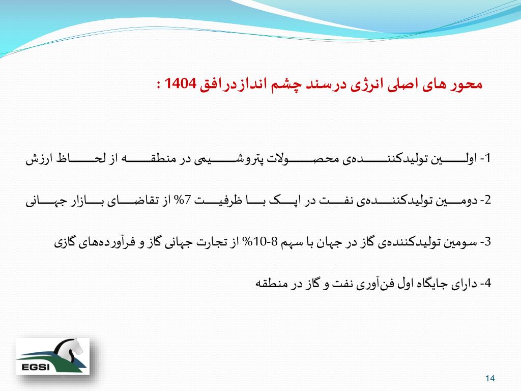 محور های اصلی انرژی در سند چشم انداز در افق 1404 : • 1- اولین تولیدکنندهی محصولات پتروشیمی در منطقه از لحاظ ارزش2- دومین تولیدکنندهی نفت در اپک با ظرفیت 7% از تقاضای بازار جهانی3- سومین تولیدکنندهی گاز در جهان با سهم 8-10% از تجارت جهانی گاز و فرآوردههای گازی • 4- دارای جایگاه اول فنآوری نفت و گاز در منطقه
