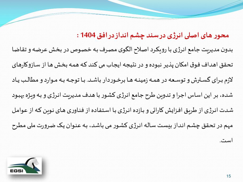 محور های اصلی انرژی در سند چشم انداز در افق 1404 : بدون مدیریت جامع انرژی با رویکرد اصلاح الگوی مصرف به خصوص در بخش عرضه و تقاضا تحقق اهداف فوق امکانپذیر نبوده و در نتیجه ایجاب می کند که همه بخش ها از سازوکارهای لازم برای گسترش و توسعه در همه زمینه ها برخوردار باشد. با توجه به موارد و مطالب یاد شده، بر این اساس اجرا و تدوین طرح جامع انرژی کشور با هدف مدیریت انرژی و به ویژه بهبود شدت انرژی از طریق افزایش کارائی و بازده انرژی با استفاده از فناوری های نوین که از عوامل مهم در تحقق چشم انداز بیست ساله انرژی کشور می باشد، به عنوان یک ضرورت ملی مطرح است.