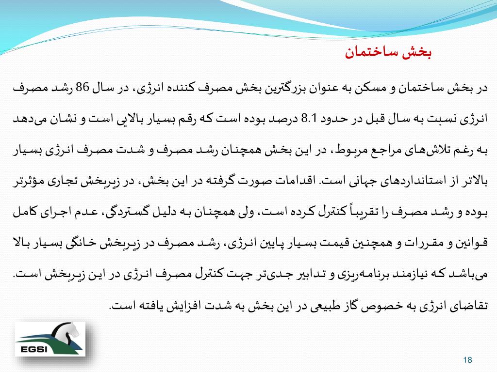 بخش ساختمان در بخش ساختمان و مسکن به عنوان بزرگترین بخش مصرف کننده انرژی، در سال 86 رشد مصرف انرژی نسبت به سال قبل در حدود 8.1 درصد بوده است که رقم بسیار بالایی است و نشان میدهد به رغم تلاشهای مراجع مربوط، در این بخش همچنان رشد مصرف و شدت مصرف انرژی بسیار بالاتر از استانداردهای جهانی است. اقدامات صورت گرفته در این بخش، در زیربخش تجاری مؤثرتر بوده و رشد مصرف را تقریباً کنترل کرده است، ولی همچنان به دلیل گستردگی، عدم اجرای کامل قوانین و مقررات و همچنین قیمت بسیار پایین انرژی، رشد مصرف در زیربخش خانگی بسیار بالا میباشد که نیازمند برنامهریزی و تدابیر جدیتر جهت کنترل مصرف انرژی در این زیربخش است. تقاضای انرژی به خصوص گاز طبیعی در این بخش به شدت افزایش یافته است.