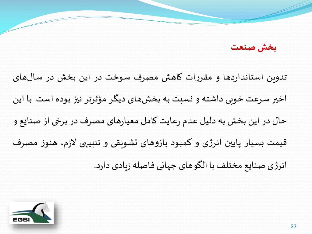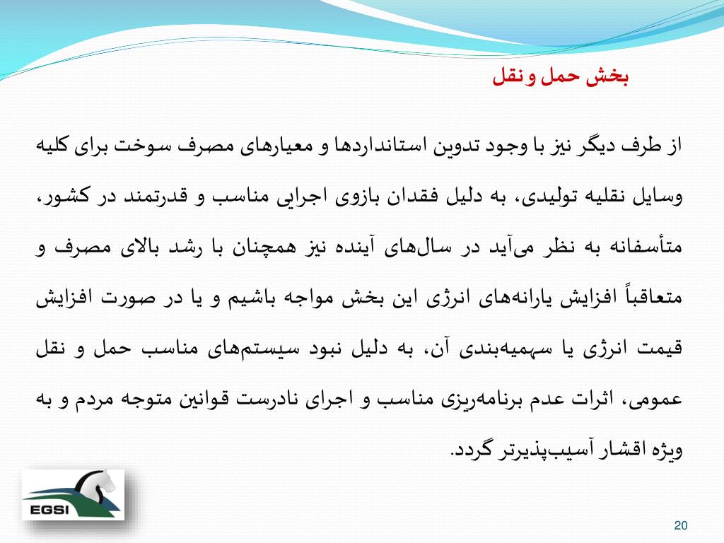بخش حمل و نقل بخش حمل و نقل به عنوان دومین بخش بزرگ مصرف کننده انرژی از نظر مقدار و بزرگترین بخش مصرفی از نظر ارزش، در سالهای اخیر دستخوش تحولات جدی شده است. مشکلات این بخش از جمله قدیمی بودن تکنولوژیهای خودروهای سبک و سنگین، عدم وجود سیستمهای حمل و نقل عمومی مناسب در کشور، فرهنگ نادرست استفاده از خودرو در بین اقشار جامعه و همچنین قیمت بسیار پایین سوخت، هزینههای یارانهای سنگینی را بر اقتصاد کشور تحمیل کرده است.