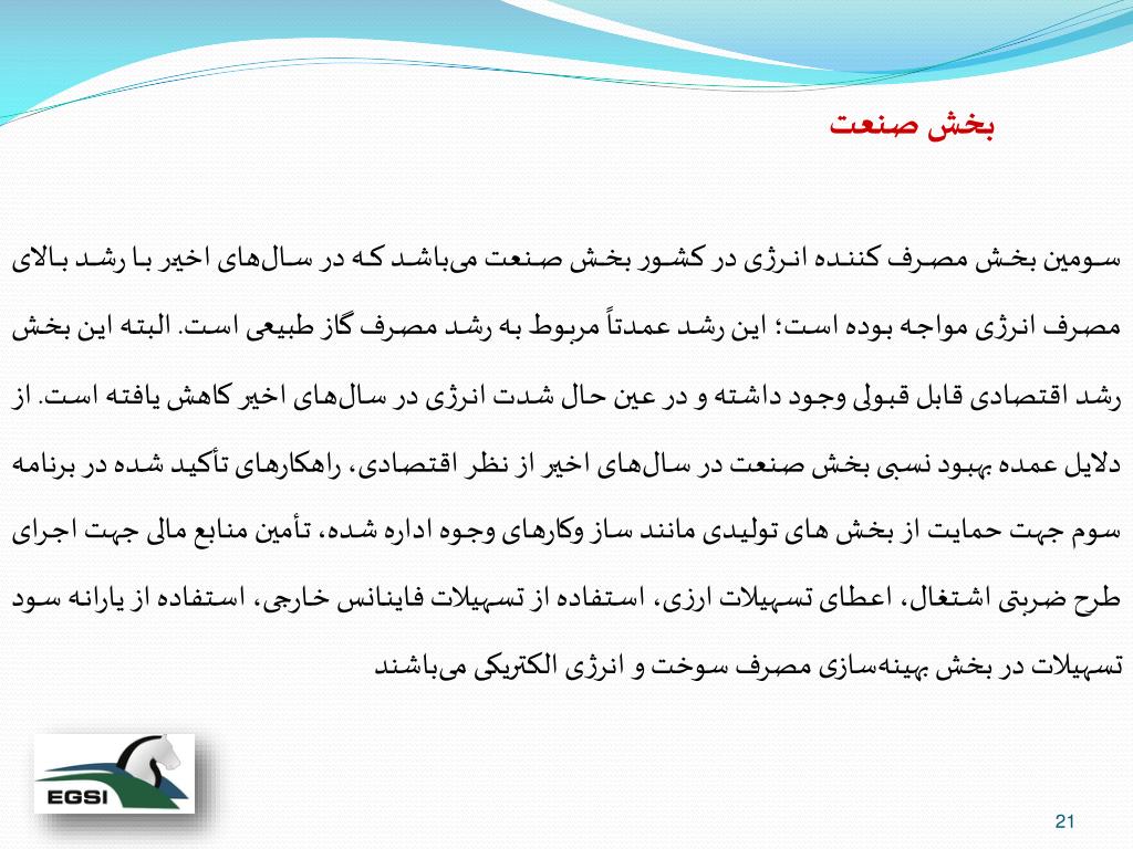 بخش صنعت سومین بخش مصرف کننده انرژی در کشور بخش صنعت میباشد که در سالهای اخیر با رشد بالای مصرف انرژی مواجه بوده است؛ این رشد عمدتاً مربوط به رشد مصرف گاز طبیعی است. البته این بخش رشد اقتصادی قابل قبولی وجود داشته و در عین حال شدت انرژی در سالهای اخیر کاهش یافته است. از دلایل عمده بهبود نسبی بخش صنعت در سالهای اخیر از نظر اقتصادی، راهکارهای تأکید شده در برنامه سوم جهت حمایت از بخش های تولیدی مانند ساز وکارهای وجوه اداره شده، تأمین منابع مالی جهت اجرای طرح ضربتی اشتغال، اعطای تسهیلات ارزی، استفاده از تسهیلات فاینانس خارجی، استفاده از یارانه سود تسهیلات در بخش بهینهسازی مصرف سوخت و انرژی الکتریکی میباشند