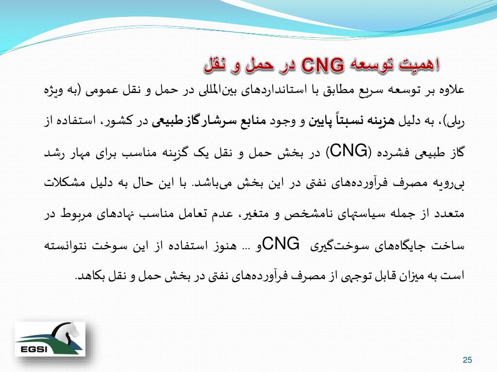 اهميت توسعه CNG در حمل و نقل علاوه بر توسعه سریع مطابق با استانداردهای بینالمللی در حمل و نقل عمومی (به ویژه ریلی)، به دلیل هزینه نسبتاً پایین و وجود منابع سرشار گاز طبیعی در کشور، استفاده از گاز طبیعی فشرده (CNG) در بخش حمل و نقل یک گزینه مناسب برای مهار رشد بیرویه مصرف فرآوردههای نفتی در این بخش میباشد. با این حال به دلیل مشکلات متعدد از جمله سیاستهای نامشخص و متغیر، عدم تعامل مناسب نهادهای مربوط در ساخت جایگاههای سوختگیری CNG و ... هنوز استفاده از این سوخت نتوانسته است به میزان قابل توجهی از مصرف فرآوردههای نفتی در بخش حمل و نقل بکاهد.
