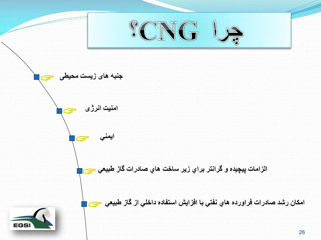 چرا CNG ؟ جنبه های زیست محیطی امنیت انرژی ايمني الزامات پيچيده و گرانتر براي زير ساخت هاي صادرات گاز طبيعي امكان رشد صادرات فراورده هاي نفتي با افزايش استفاده داخلي از گاز طبيعي